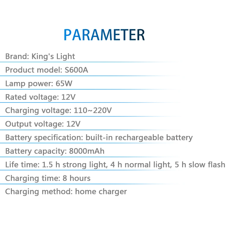 Product Name: King's Light S600A قابلة للشحن ضوء قوي محمول كشاف 12V65W في الهواء الطلق طويلة المدى إضاءة مقاومة للماء الشعلة